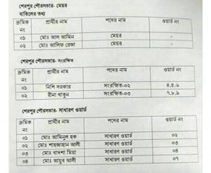 ২ মেয়র পদে স্বতন্ত্রপ্রার্থী ত্রুটিজনিত কারণে মো. আল আমিন ও তথ্য গোপনের কারণে মো. আরিফ রেজার মনোনয়নপত্র অবৈধ ঘোষনা করা হয়। সংরক্ষিত মহিলা কাউন্সিলর পদে সংরক্ষিত-২ (৪,৫,৬ নং ওয়ার্ড)-এর প্রার্থী নিশি সরকার ও সংরক্ষিত-৩ (৭,৮,৯ নং ওয়ার্ড)-এর প্রার্থী রিনা খাতুনের মনোনয়ন অবৈধ বলে গন্য হয়। আর সাধারণ কাউন্সিলর পদে ২নং ওয়ার্ডের মো. আমিনুল হক, ৩নং ওয়ার্ডের মো. শাহজাহান আলী, ৪নং ওয়ার্ডে মো. বাদশা মিয়া ও ৭নং ওয়ার্ডে মো. আইয়ুব আলীর মনোনয়ন অবৈধ ঘোষনা করা হয়।