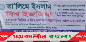 জানা গেছে, ২০২৩ সালের ৪, ৫ ও ৬ জানুয়ারী বুধবার, বৃহস্পতিবার ও শুক্রবার মানিকগঞ্জের সিদ্দিক নগরের পটল বিল এলাকায় তা’লিমে ইসলাম মনিকগঞ্জ বাংলাদেশ-এর পক্ষে তিন দিনব্যাপী বিশ্ব ইজতেমা অনুষ্ঠিত হবে। ৭ জানুয়ারী শনিবার সকালে আখেরী মোনাজাত অনুষ্ঠিত হবে। এ ইজতেমায় দেশের বিভিন্ন এলাকা থেকে তা’লিমে ইসলামের সদস্যবৃন্দ ও মানিকগঞ্জ দরবার শরীফের অনুসারীসহ বিভিন্ন পেশা শ্রেণীর ধর্ম প্রাণ মুসলিম জনতা হালকায়ে জিকিরসহ দলে দলে উপস্থিত হবেন বলে সংশ্লিষ্ঠরা আশাব্যক্ত করেন।