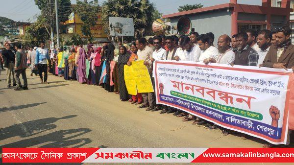 শেরপুরের নালিতাবাড়ী উপজেলার ভোগাই ও চেল্লাখালী নদী থেকে অবৈধভাবে বালু উত্তোলণ বন্ধের দাবীতে মানববন্ধন অনুষ্ঠিত হয়েছে। বৃহস্পতিবার (২৬ ডিসেম্বর) দুপুরে “নালিতাবাড়ী উপজেলার জনগণ” এর ব্যানারে উপজেলা পরিষদের সামনে এ মানববন্ধন