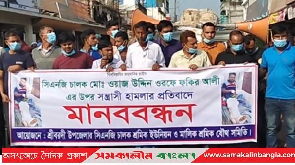 শেরপুরে সিএনজি চালক ওয়াজ উদ্দিন ওরফে ফকির আলীকে মারধরের প্রতিবাদে শ্রীবরদী উপজেলায় মানববন্ধন ও প্রতিবাদ সভা অনুষ্ঠিত হয়েছ। মঙ্গলবার (১৬ নভেম্বর) দুপুরে শ্রীবরদী চৌরাস্তা মোড়ে উপজেলা সিএনজি চালক ও শ্রমিক