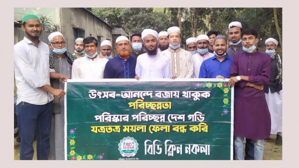 শেরপুর জেলার নকলা উপজেলায় মসজিদে বিয়ের আনুষ্ঠানিকতা সম্পন্ন করার পরে “উৎসব আনন্দে বজায় থাকুক পরিচ্ছন্নতা, পরিষ্কার পরিচ্ছন্ন দেশ গড়ি, যত্রতত্র ময়লা ফেলা বন্ধ করি” এমন সব শ্লোগানে পরিচ্ছন্নতার বার্তা নিয়ে