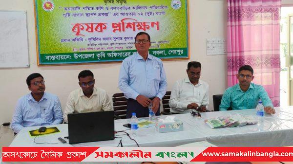 শেরপুরের নকলায় অনাবাদি পতিত জমি ও বসতবাড়ির আঙ্গীনায় পারিবারিক সবজি পুষ্টি বাগান স্থাপন প্রকল্পের আওতায় ২ দিন ব্যাপী কৃষক প্রশিক্ষণের উদ্বোধন করা হয়েছে। এ উপলক্ষে সোমবার কৃষি সম্প্রসারণ অধিদপ্তরের বাস্তবায়নে