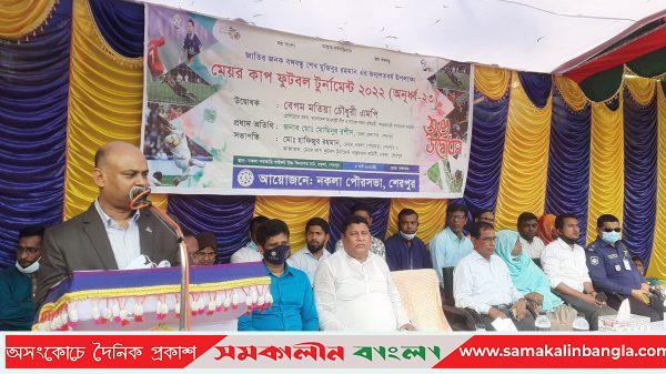 বাঙালি জাতির পিতা বঙ্গবন্ধু শেখ মুজিবুর রহমান-এঁর জন্ম শতবার্ষিকী উপলক্ষে শেরপুর জেলার নকলা পৌরসভার উদ্যোগে ও আয়োজনে মেয়র কাপ ফুটবল টুর্নামেন্ট-এর শুভ উদ্বোধন করা হয়েছে। এ উপলক্ষে মঙ্গলবার (৮ মার্চ)