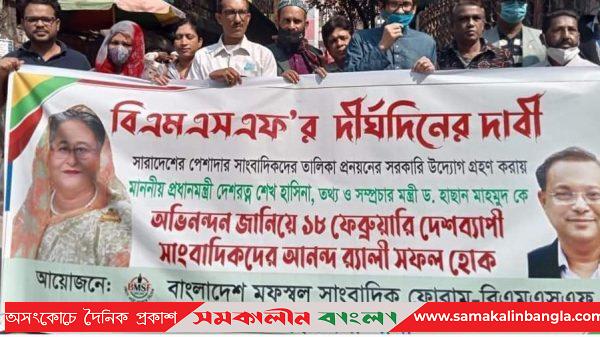 ময়মনসিংহে প্রধানমন্ত্রী ও তথ্যমন্ত্রীকে অভিনন্দন জানিয়ে আনন্দ শোভাযাত্রা করেছে বাংলাদেশ মফস্বল সাংবাদিক ফোরাম (বিএমএসএফ)-এর ময়মনসিংহ শাখা। বিএমএসএফ-এর ১৪ দফা দাবী অনুযায়ী প্রথম দফা সরকারি ভাবে সারাদেশে সাংবাদিক নিবন্ধন কাযক্রম বাস্তবায়নের