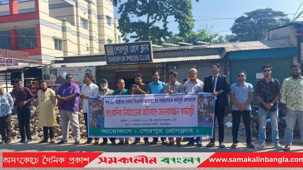 ঢাকায় বিএনপি’র মহাসমাবেশে দায়িত্ব পালনকালে সাংবাদিকদের উপর হামলা, নির্যাতন ও হত্যার প্রতিবাদে শেরপুরে মানববন্ধন কর্মসূচি পালন করা হয়েছে। বুধবার (১ নভেম্বর) সকাল ১০টায় শেরপুর প্রেসক্লাবের আয়োজনে প্রেসক্লাবের সামনে জামালপুর-শেরপুর সড়কে