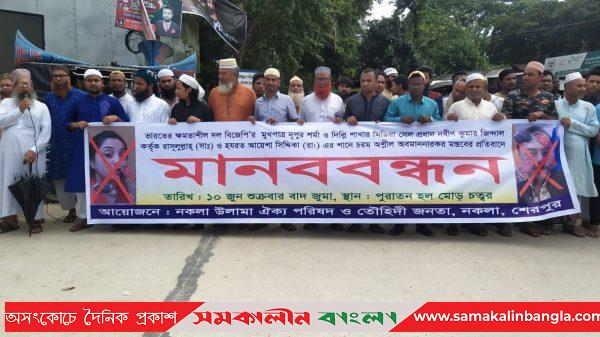 বাংলাদেশের পাশ্ববর্তী দেশ ভারতের ক্ষমতাসীন দল বিজেপির দুই নেতা মহানবী হযরত মুহাম্মদ (সা) সম্পর্কে কুরুচিপূর্ণ মন্তব্য করায় শেরপুরের নকলায় মানববন্ধন ও বিক্ষোভ সমাবেশ করা হয়েছে। শুক্রবার (১০ জুন) জুমা নামাজের