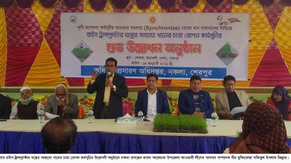 শেরপুর জেলার নকলা উপজেলায় সরকারের নির্দেশনা মোতাবেক স্বাস্থ্য বিধি মেনে ২০২০-২০২১ অর্থ বছরের প্রণোদনা কর্মসূচির আওতায় রাইস ট্রান্সপ্লান্টার যন্ত্রের সাহায্যে সমলয়ে বোরো ধানের চারা রোপন কর্মসূচি উদ্বোধন করা হয়েছে। এ