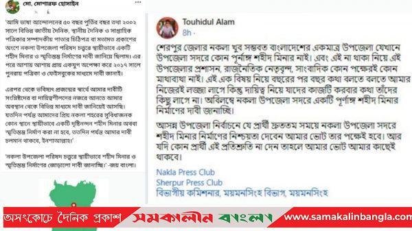 শেরপুরের নকলা উপজেলা পরিষদ চত্ত্বরে স্থায়ীভাবে শহীদ মিনার ও মুক্তিযুদ্ধের স্মৃতিস্তম্ভ নির্মাণের জোড়ালো দাবী উঠেছে। উপজেলার প্রথম ও একমাত্র ইংরেজী মাধ্যমে পরিচালিত বিদ্যাপীঠ ‘পাঠশালা’ এর প্রতিষ্ঠাতা অধ্যক্ষ মুহাম্মদ তৌহিদুল আলম রাসেল,