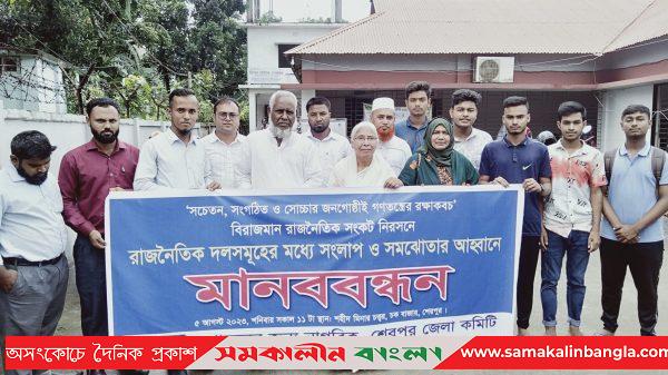আগন জাতীয় নির্বাচনকে কেন্দ্রকরে দেশে বিরাজমান রাজনৈতিক সংকট নিরসনে রাজনৈতিক দলসমূহের মধ্যে সংলাপ ও সমঝোতার আহবানে শেরপুরে সুশাসনের জন্য নাগরিক (সুজন) এর উদ্যোগে মানববন্ধন করা হয়েছে। শনিবার (৫ আগস্ট) দুপুরের