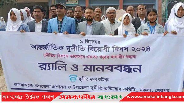 আন্তর্জাতিক দুর্নীতি বিরোধী দিবস-২০২৪ উপলক্ষে শেরপুরের নকলায় র্যালি ও মানববন্ধন অনুষ্ঠিত হয়েছে। ‘দুর্নীতির বিরুদ্ধে তারুণ্যের একতা: গড়বে আগামীর শুদ্ধতা’ এ প্রতিপাদ্যকে ধারন করে উপজেলা প্রশাসন ও উপজেলা দুর্নীতি প্রতিরোধ কমিটির
