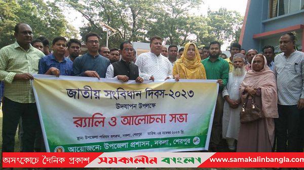 সারাদেশের ন্যায় শেরপুরের নকলায় জাতীয় সংবিধান দিবস-২০২৩ যতাযথ মর্যাাদায় উদযাপন করা হয়েছে। শনিবার (৪ নভেম্বর) সকালে উপজেলা প্রশাসনের আয়োজনে একটি র্যালী বের করা হয়। পরে উপজেলা পরিষদ মিলনায়তনে উপজেলা নির্বাহী