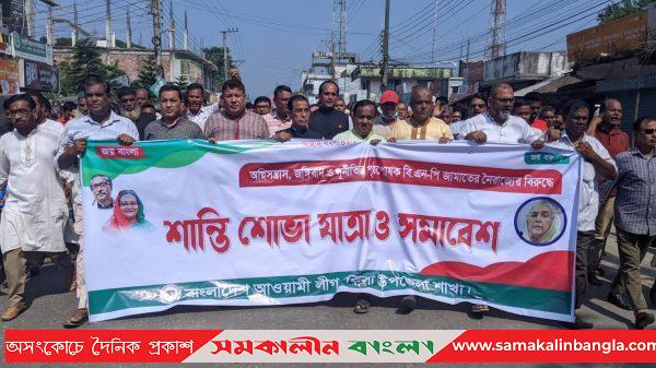 শেরপুরের নকলায় উপজেলা আওয়ামী লীগের আয়োজনে অনুষ্ঠিত শান্তি শোভাযাত্রা ও সমাবেশে উপজেলা আওয়ামী লীগের নেতৃবৃন্দসহ ইউনিয়ন, পৌরসভা ও ওয়ার্ড আওয়ামী লীগ ও অঙ্গসহযোগী সংগঠনের নেতা-কর্মী, সমর্থক ও বিভিন্ন পেশাশ্রেণী ভোটারদের