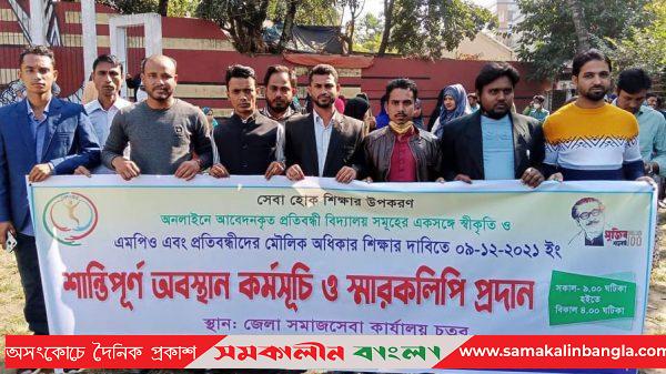 শেরপুরে অনলাইনে আবেদনকৃত প্রতিবন্ধী বিদ্যালয় সমূহের শিক্ষক-কর্মচারীগন বিভিন্ন দাবি বাস্তবায়নের লক্ষে শান্তিপূর্ণ অবস্থান কর্মসূচি ও যথাযথ কর্তৃপক্ষের কাছে স্মারকলিপি প্রদান করেছেন। বৃহস্পতিবার (৯ ডিসেম্বর) সকাল ৯ টা হতে বিকেলে ৪