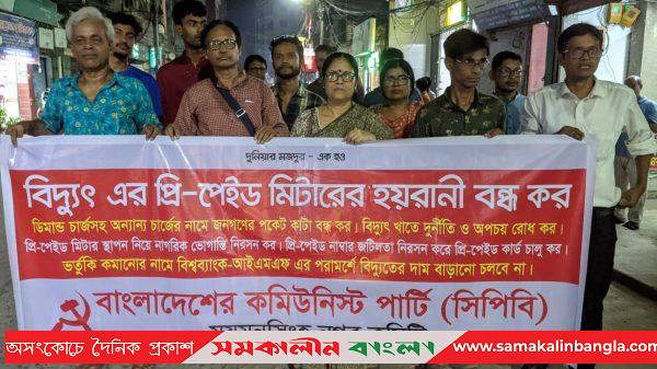 ময়মনসিংহে বিদ্যুৎ বিল পরিশোধের ক্ষেত্রে প্রি-পেইড মিটারের মাধ্যমে বিভিন্ন ভাবে জনগনকে হয়রানী বন্ধ করতে বাংলাদেশ কমিউনিস্ট পার্টি (সিপিবি) এর ময়মসিংহ নগর কমিটির নেতৃবৃন্দরা দাবি জানিয়ে মিছিল ও সভা করেছেন। এ