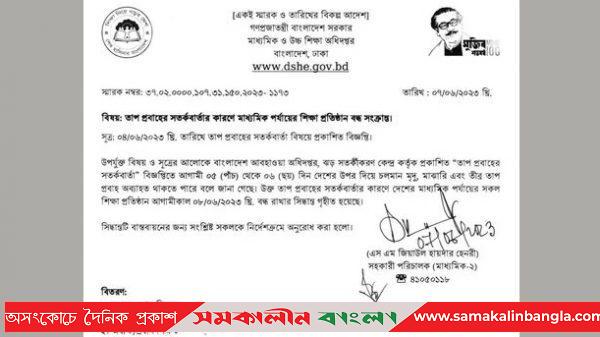 দেশব্যাপী তীব্র তাপদাহের কারণে সরকারি প্রাথমিক বিদ্যালয় চারদিন বন্ধ ঘোষণার পরে এবার কোমলমতি ছাত্র-ছাত্রীদের স্বাস্থ্য সুরক্ষা বিবেচনা করে দেশের মাধ্যমিক পর্যায়ের সকল শিক্ষা প্রতিষ্ঠান একদিনের (বৃহস্পতিবার, ৮ জুন) ছুটি ঘোষণা