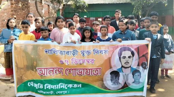 শেরপুরের নালিতাবাড়ী হানাদারমুক্ত দিবস উদযাপন উপলক্ষে বেসরকারী শিক্ষা প্রতিষ্ঠান সেঁজুতি বিদ্যানিকেতন ও একুশে পাঠচক্র-এর যৌথ আয়োজনে বিজয় শোভাযাত্রা ও আলোচনা সভা অনুষ্ঠিত হয়েছে। রবিবার সকালে ‘এসো মিলি লাল সবুজের পতাকায়’-এ