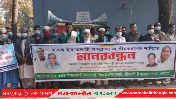 শেরপুরের শ্রীবরদীতে স্বতন্ত্র ইবতেদায়ী মাদরাসা জাতীয়করণের দাবিতে মানববন্ধন ও স্মারক লিপি প্রদান করা হয়েছে। বুধবার (৯ ফেব্রুয়ারি) সকালে উপজেলা পরিষদ চত্বরে স্বতন্ত্র ইবতেদায়ী মাদরাসা শিক্ষক ঐক্যজোট শ্রীবরদী উপজেলা শাখার উদোগে