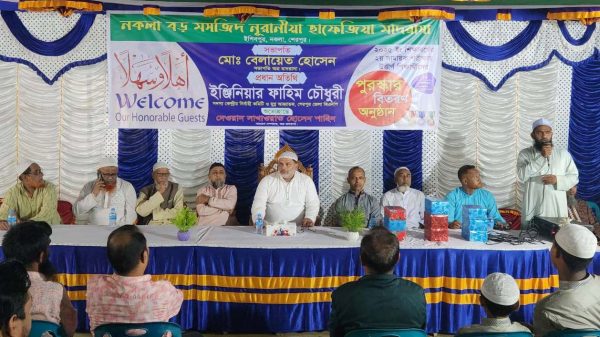 শেরপুরের নকলায় নকলা বড় মসজিদ নূরানীয়া হাফেজিয়া মাদ্রাসার দ্বিতীয় সাময়িক পরীক্ষায় উত্তীর্ণ শিক্ষার্থীদের মাঝে পুরষ্কার বিতরণ করা হয়েছে। এ উপলক্ষ্যে মঙ্গলবার মাদ্রাসা মাঠে মাদ্রাসা পরিচালনা পরিষদের সভাপতি মো. বেলায়েত হোসেনের