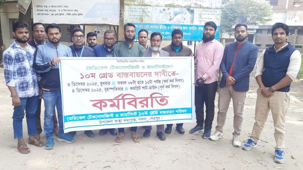 স্বাস্থ্য বিভাগে কর্মরত মেডিকেল টেকনোলজিস্ট ও ফার্মাসিস্টদের দশম গ্রেড বাস্তবায়নের দাবিতে শেরপুরের নকলায় অর্ধদিবস কর্মবিরতি কর্মসূচি পালন করা হয়েছে। বৃহস্পতিবার পূর্ণ দিবস (কমপ্লিট শাট-ডাউন) কর্মসূচি পালন করা হবে। মেডিকেল টেকনোলজিস্ট
