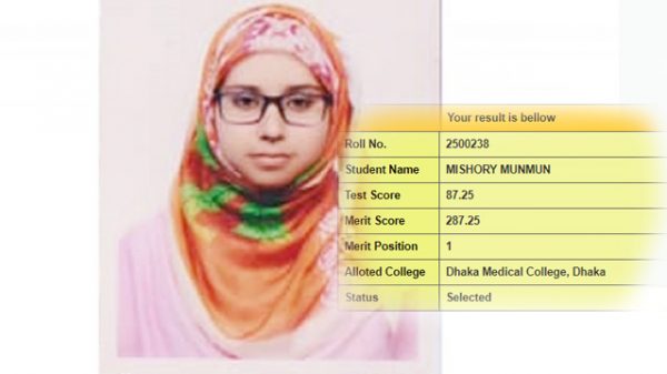 ২০২০-২১ শিক্ষাবর্ষের এমবিবিএস ভর্তি পরীক্ষার ফলাফল প্রকাশিত ফলাফলে পাস করেছেন ৪৮ হাজার ৯৭৫ জন। এবার মেধাতালিকায় প্রথম স্থান অধিকার করেছেন মিশোরী মুনমুন। তার রোল নম্বর ২৫০০২৩৮। তিনি পাবনা মেডিকেল কলেজ